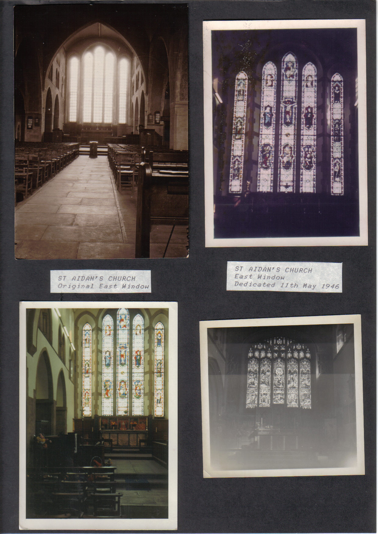 The window was designed by Mr Harry Grylls of London and the original sketch was exhibited in the Royal Academy of 1941, prior to being submitted to St Aidan’s in 1942. The window covers the whole of the east side of the church above the chancel and consists of five lights. The three central lights are flanked by lancets and separated by wide stonework in the character of the 13th Century and the stained-glass has been designed to conform with its shape and period. The centre portion consists of richly coloured panels running through the three lights of patterned grisaille, while the side lights have single standing figures under canopies in a similar grisaille. In the upper part of the centre light is the figure of Christ in majesty, seated on a rainbow, and in the side lights are censing angels. Below this is the Crucifixion with the attendant figures of St. Mary and St. John, and behind the figure of Christ is the sun in the eclipse; whilst underneath this is the Virgin enthroned with, on one side, the Three Kings bringing gifts and, on the other, the shepherds with their offerings. Six Celtic Saints are depicted in the side lancets. On the north side are St. Aidan with a stag at his feet; St. Cuthbert holding the head of Oswald in his hands, and St. Wilfrid at the top. On the south side are St. Chad bearing Lichfield Cathedral, St. Oswald with a rude wooden cross, and St. Bede, the scholar who translated St. John’s Gospel into English.